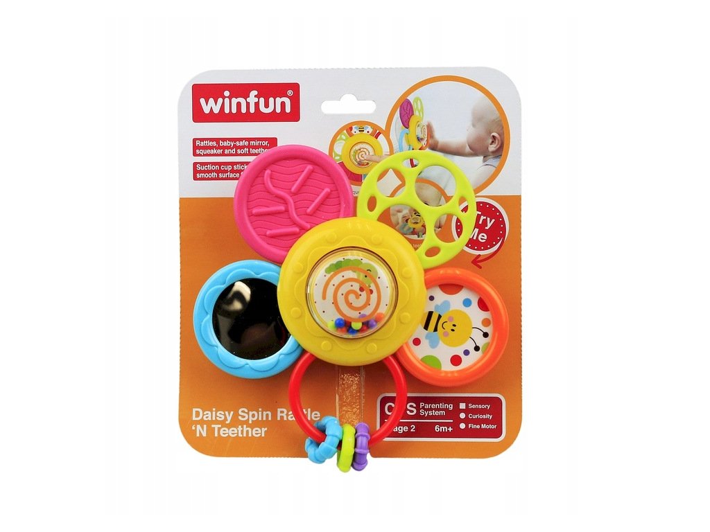 Ez a játék számos elemet tartalmaz: csörgő, csipogó, biztonsági tükör és csipogó . Rögzítse a racsnit egy sima felületre. A baba pörgesse a margarétát a kisujjak gyakorlása során. A puha fogzási játékok megnyugtatják a baba ínyét. A színes, mozgatható elemek aktiválják a gyermeket, és elősegítik az érzékelés és a finommotoros készségek fejlődését.