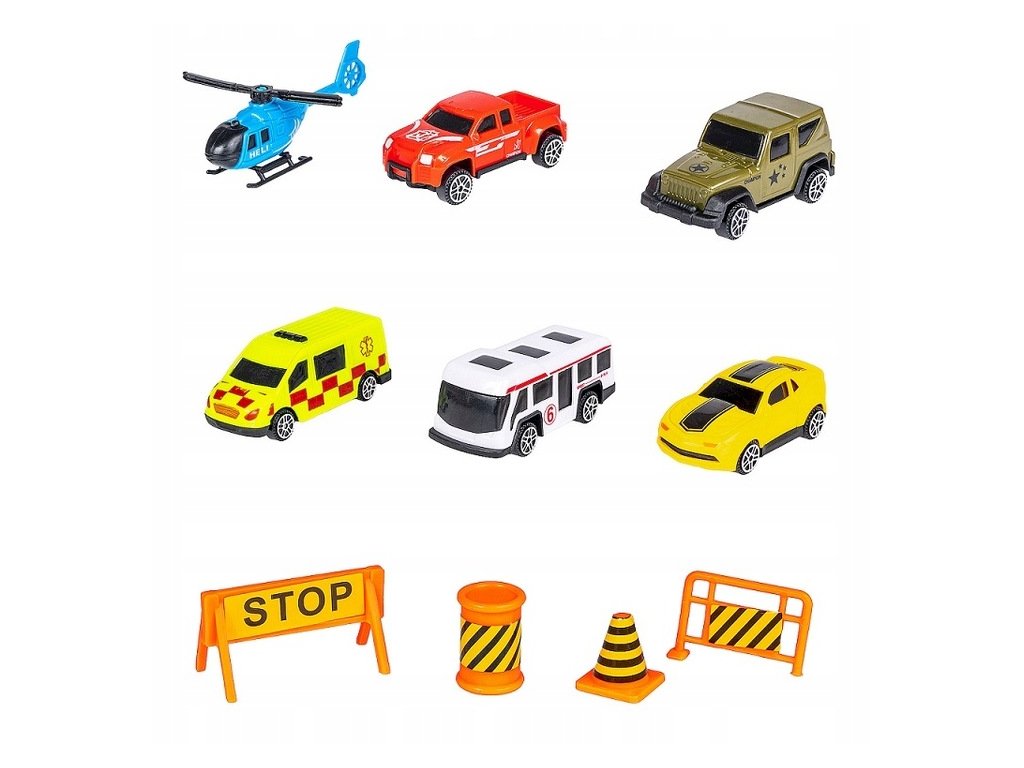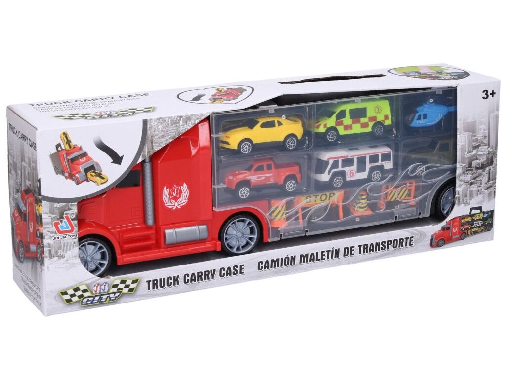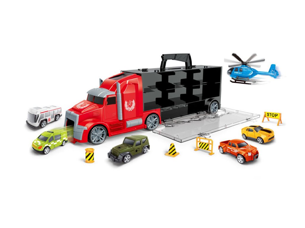 Egy nyerges vontató autókkal. Traktor mérete 42 cm. Szabad kerekek. Tartalmaz 5 autót, 1 helikoptert. Az autók a csomagoláson lévő kép szerint áthaladhatnak a kabinon. Az utánfutó mindkét oldalán van egy-egy autótálca.