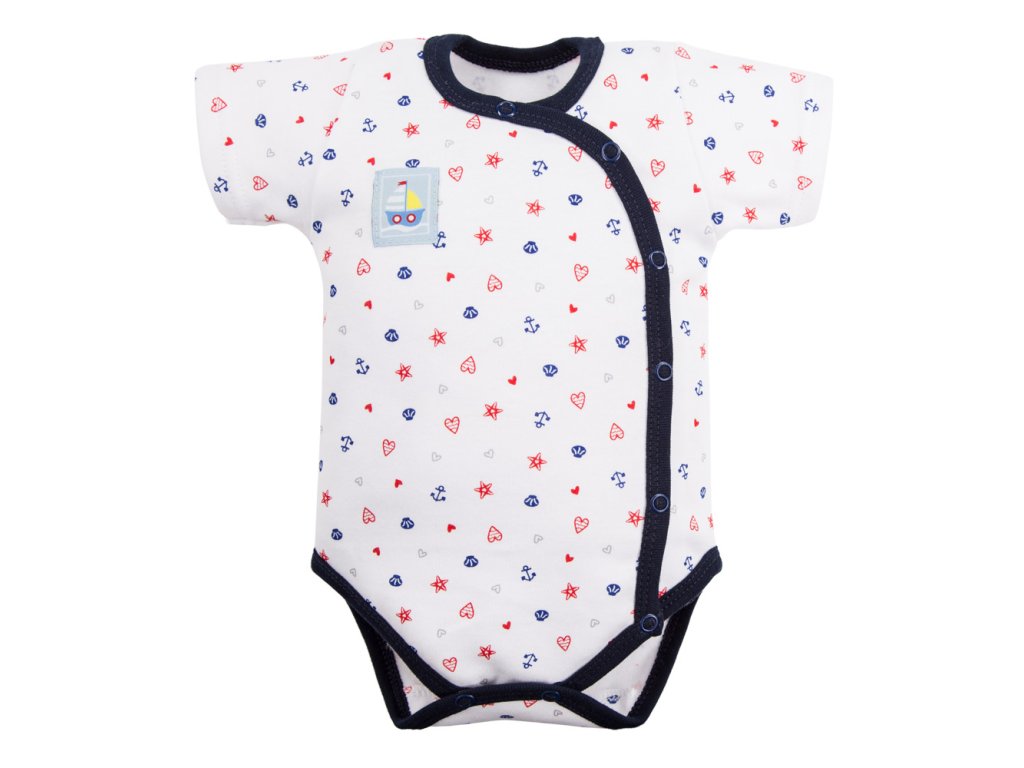 Rövidujjú body a "STATKI" kollekcióból, puha és kellemes tapintású pamut anyagból, gyermekbiztos színekkel készült nyomtatással.