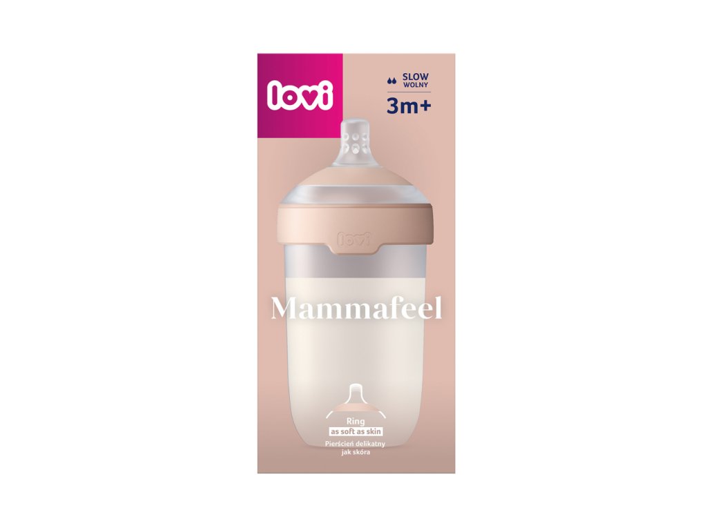 Az innovatív Mammafeel cumisüveg a lehető legjobban hasonlít a mama melleire szín, forma, melegség és dinamika tekintetében. A dinamikus cumisüveg lehetővé teszi a természetes ritmusú szopást, és nem zavarja a szopási reflexet. 250ml-es palack méret, 3m+ SLOW szopókaáramlással.