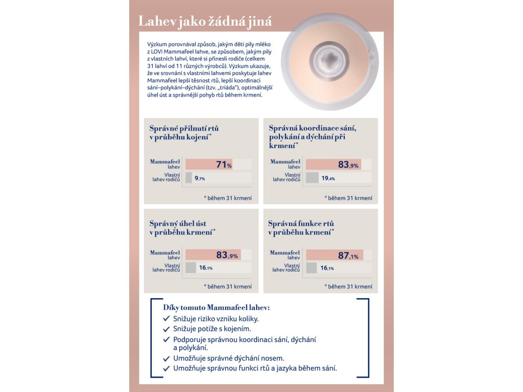 A Mammafeel cumisüvegben található dinamikus szívófej nemcsak a lehető legjobban utánozza a mell közelségét és a természetes szopást, de nem zavarja a szopási reflexet sem, így a baba szabadon visszatérhet a mellhez, és közvetlenül az anyától szívhatja a tejet.