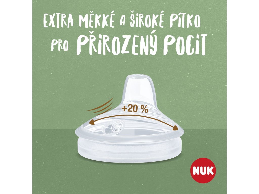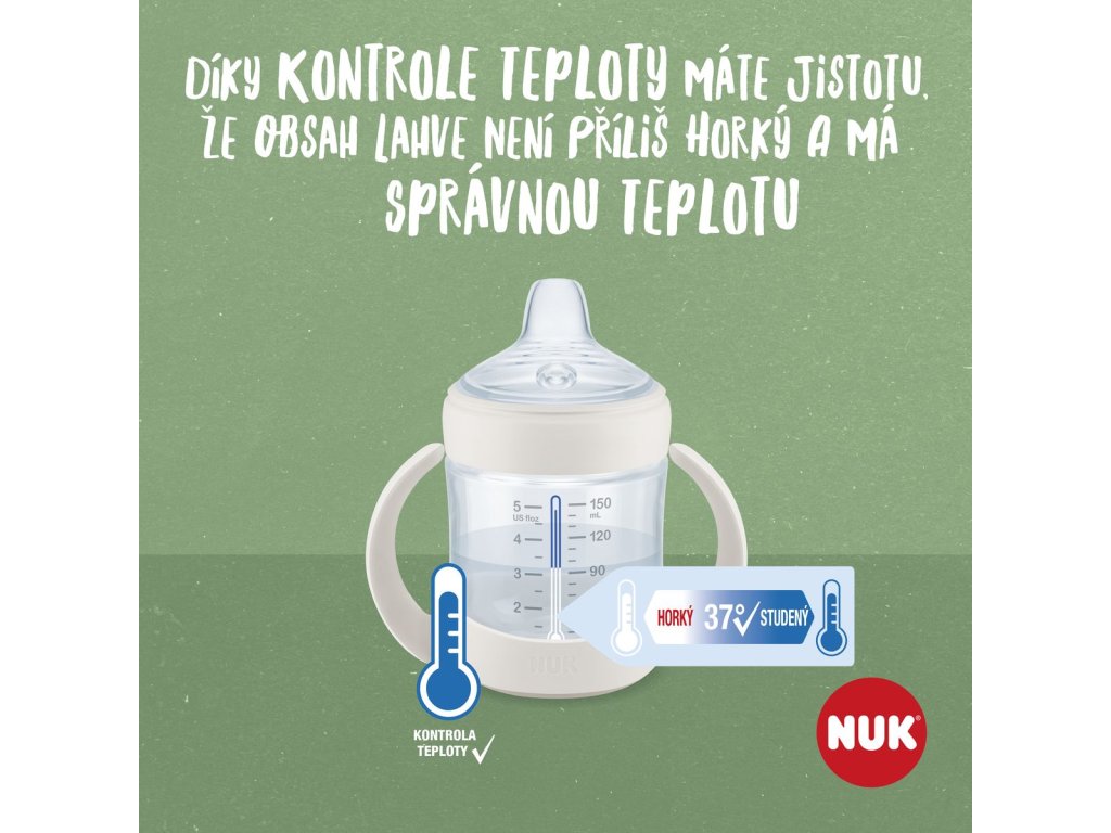 A cumisüvegről az önálló ivásra való áttérésnek teljesen természetesnek kell lennie. Ezért a NUK for Nature Learning cumisüveg kifolyója különösen puha és széles ajakkal rendelkezik. Természetesen ez is szűkös. Ezenkívül van egy innovatív NUK hőmérsékletjelző, amely kékről fehérre vált, ha a cumisüveg tartalma túl forró. A folyadéknak ideális esetben testhőmérsékletűnek kell lennie (37 °C = középkék árnyalat). Ez még kényelmesebbé teszi az ivástanulást.