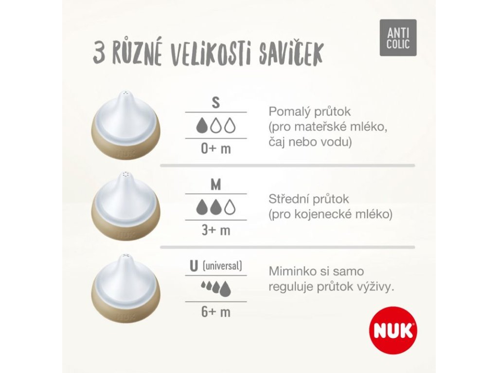 A NUK anti-kólika szelep és a három különböző szopóka közül választhatunk a folyadék egyenletes áramlásáról.