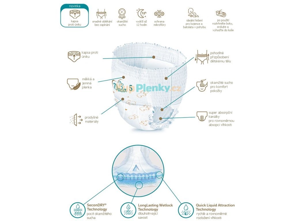 Dada Az Extra Care nadrág tökéletes megoldás még a legérzékenyebb bababőr számára is. Puha és szellős, és a felhasznált anyagoknak köszönhetően védi a baba bőrét, valamint az alkalmazott innovatív SeconDRY technológiának köszönhetően, amely rendkívül gyorsan eloszlatja a nedvességet a pelenka belsejében, távol tartja azt a baba bőrétől, és biztosítja, hogy azonnal száraz legyen