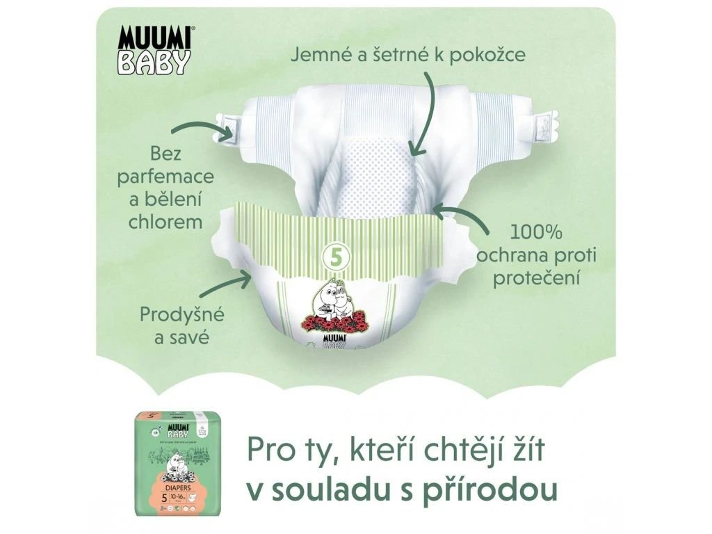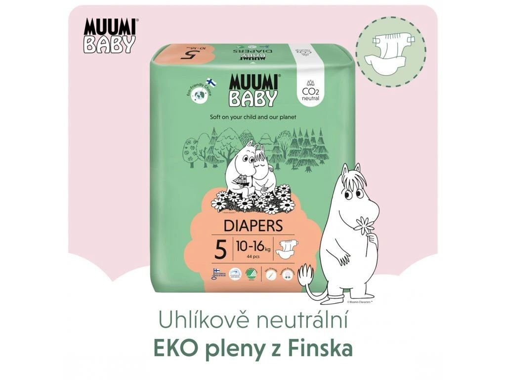 A pelenkák környezeti terhelésének kiszámításakor a pelenka teljes életciklusát figyelembe kell venni, a nyersanyagtól a gyártáson át az ártalmatlanításig. A Muumi Baby pelenkák gondosan kiválasztott, helyi gyártóktól származó alapanyagokból készülnek. A pelenkákban található finn cellulóz Muumi Baby teljesen klórmentes, és 100%-ban tiszta oxigénnel fehérítik. Ez a legbiztonságosabb megoldás a környezet és a csecsemők bőre számára. A pelenkák Muumi Baby nem tartalmaznak klórt, így normál hulladékként ártalmatlaníthatók. A csomagolás 25%-ban újrahasznosított műanyagból készült, és újrahasznosítható.