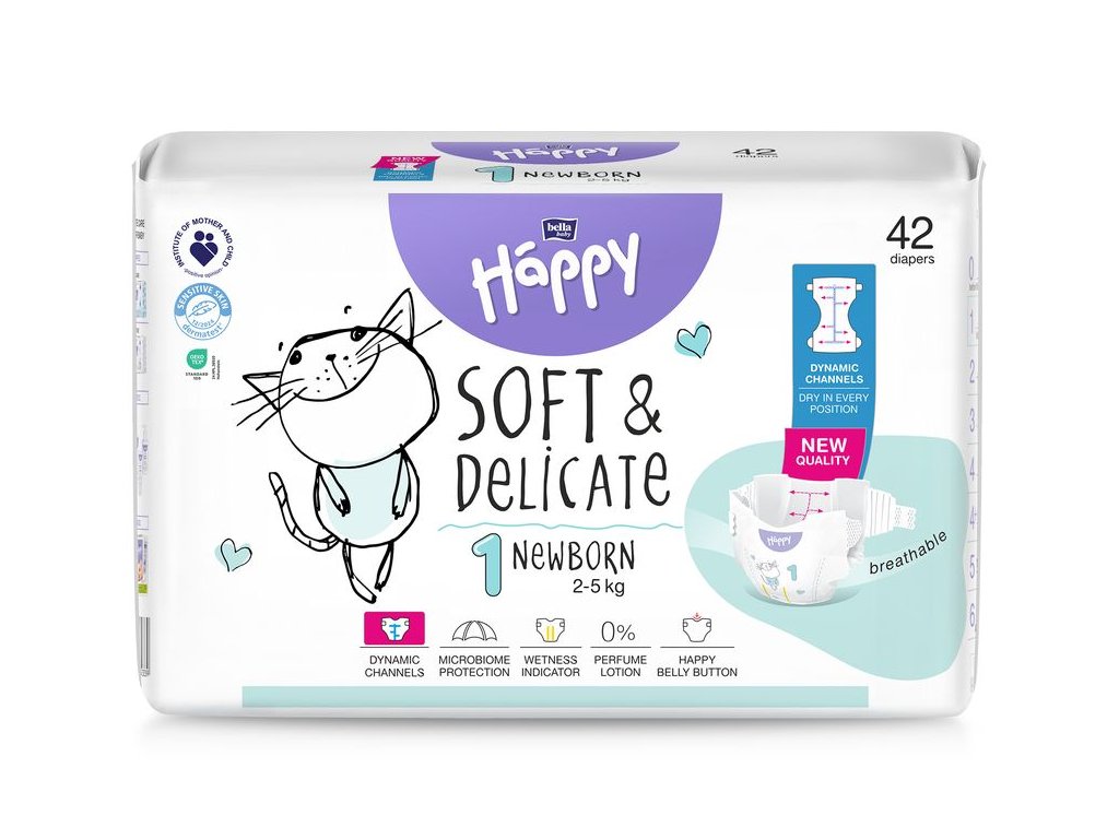 A Happy Soft & Delicate újszülött pelenkák (1) 2-5 kg súlyú újszülöttek számára ajánlott. A legmagasabb minőségű anyagokból készülnek, tökéletesen alkalmazkodnak a baba testéhez, és kellemes, száraz érzést biztosítanak. Úgy tervezték, hogy megfeleljenek a legérzékenyebb bőr igényeinek - nem tartalmaznak allergéneket, és minimálisra csökkentik a pelenkakiütés kockázatát.
