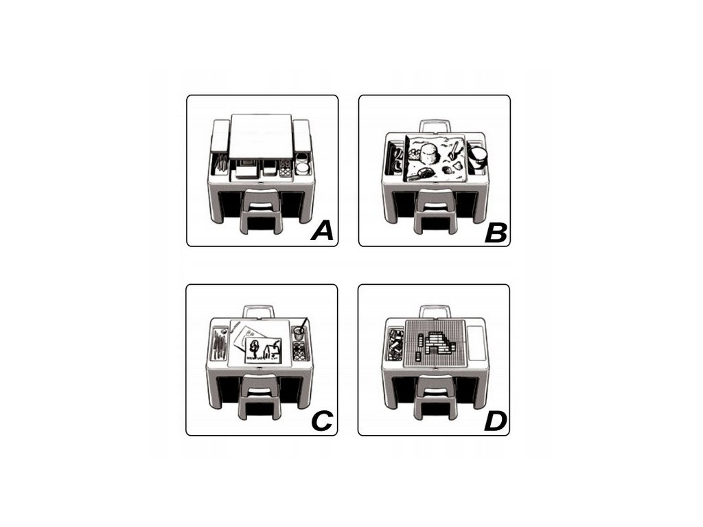 - A munkalap alatt három, körülbelül 8 cm mély tartály található. Játékokat, zsírkrétákat és egyéb apró tárgyakat tárolhat bennük.