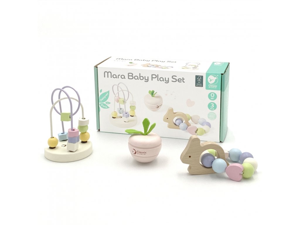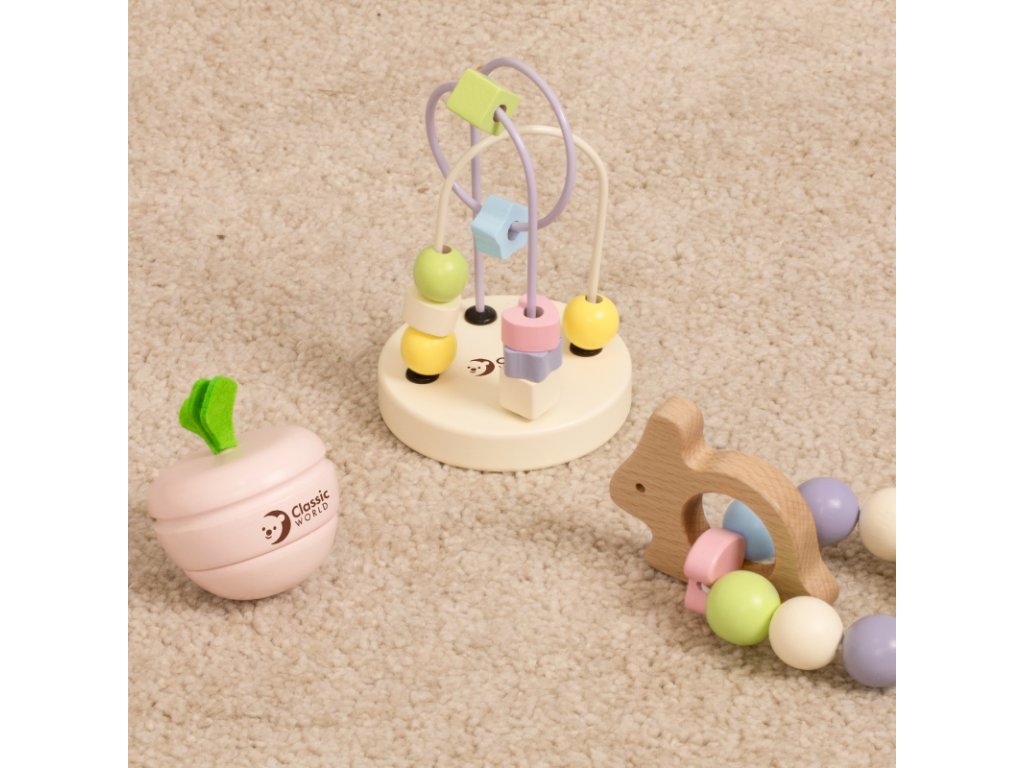 A pasztell motoros készségek fejlesztésére szolgáló készlet csecsemőknek a CLASSIC WORLD egy finom színű fa készlet, amely örömet okoz a újszülötteknek az első naptól kezdve . A készlet tartalmaz egy sárgarépát , amely rázáskor hanghatásokat ad ki, serkentve a figyelmüket, valamint egy nyúl alakú csörgőt gyöngyökkel , amelynek színe és hangja vonzó játékká teszi a csecsemők számára. Az elemek finom textúrájúak , ami tovább fejleszti érzékszervi képességeiket. A kicsit idősebb gyermekek számára van még egy gyöngy labirintus , amelyet lehet forgatni és mozgatni az úton. Ez segít javítani a koncentrációt és a motoros készségeket .