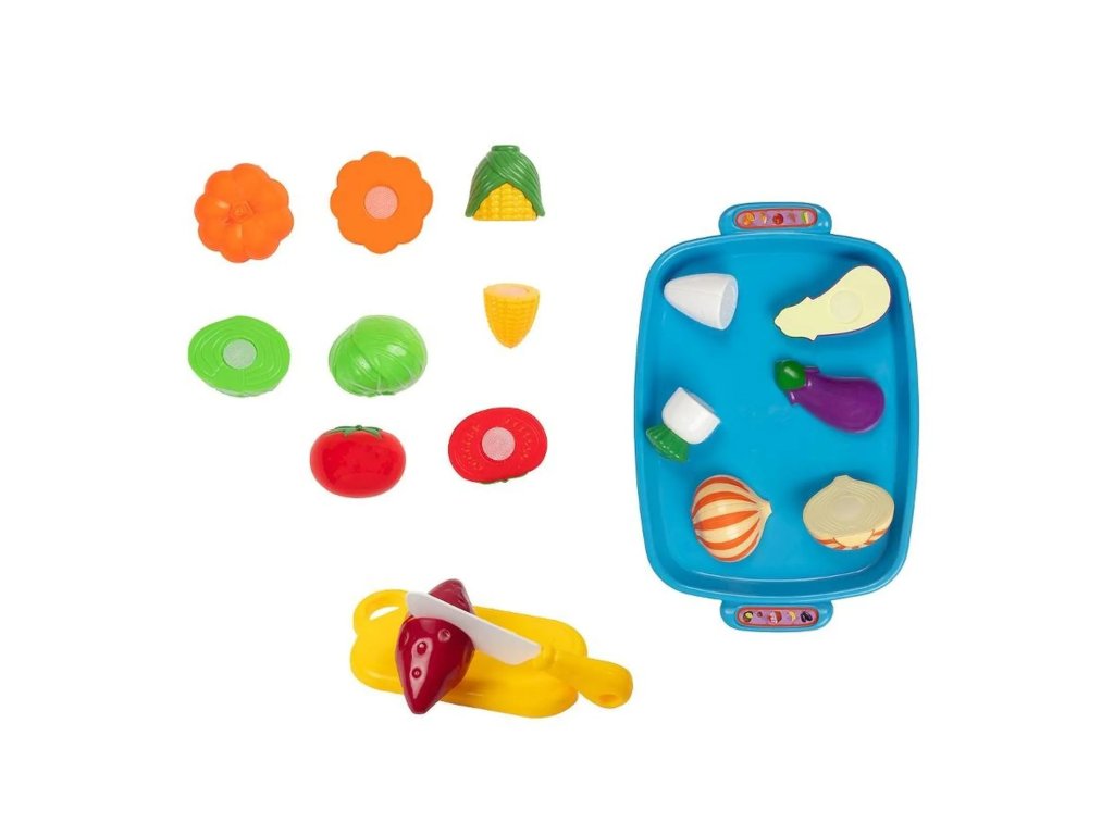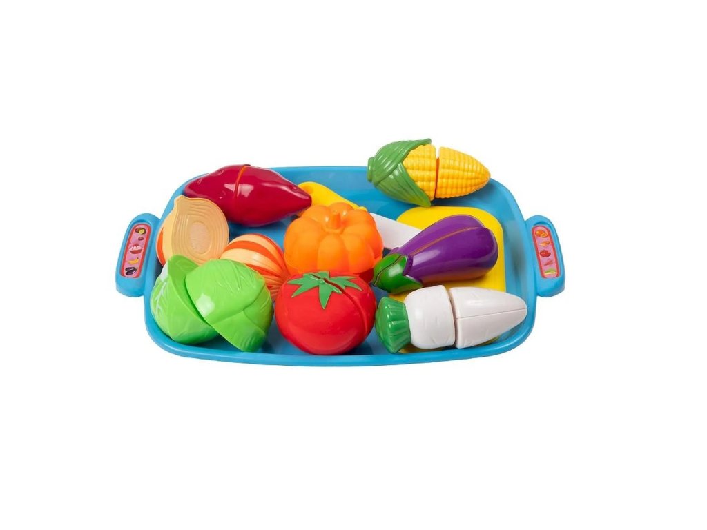 Tartalmaz: Tálca a zöldségek és gyümölcsök felszolgálásához és elrendezéséhez., Szeletelőkés: Műanyag pengével, biztonságos a gyermekek számára., Vágódeszka: Puha műanyagból készült, lehetővé teszi a biztonságos szeletelést.