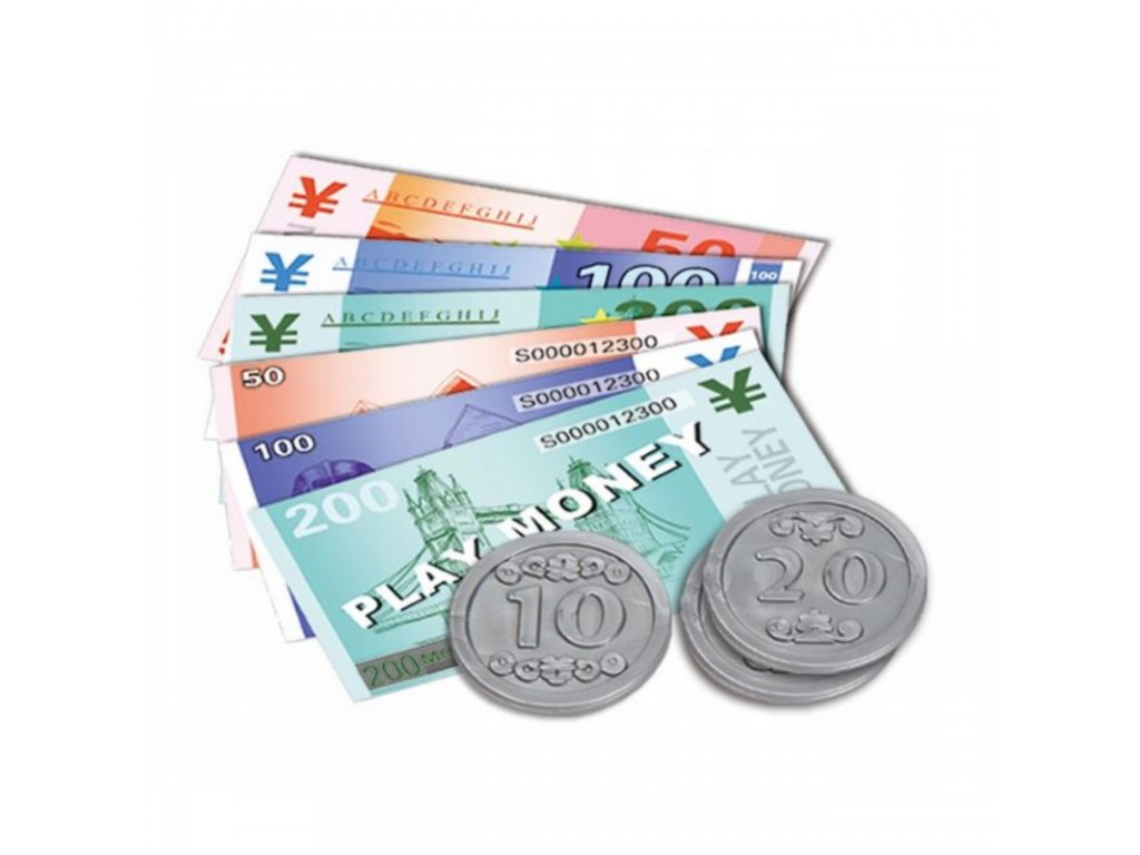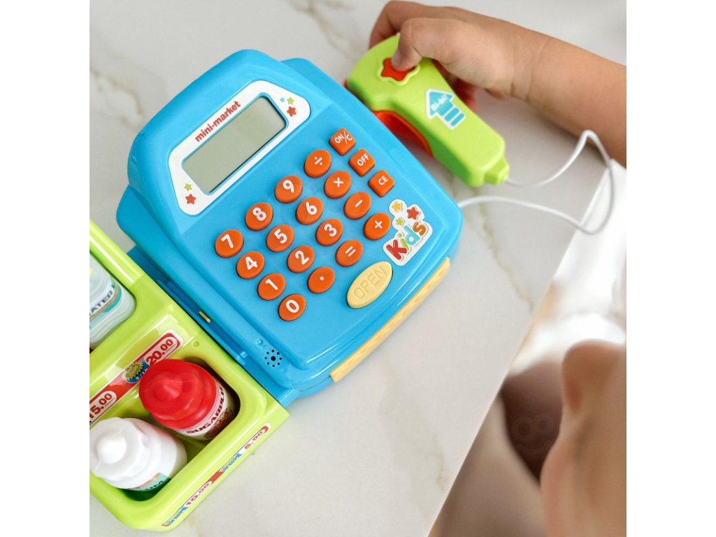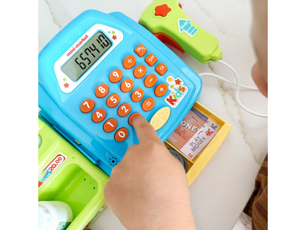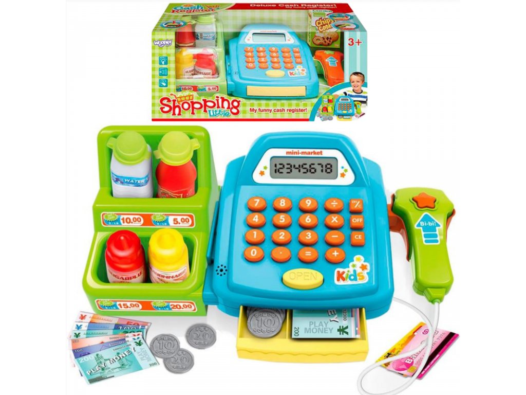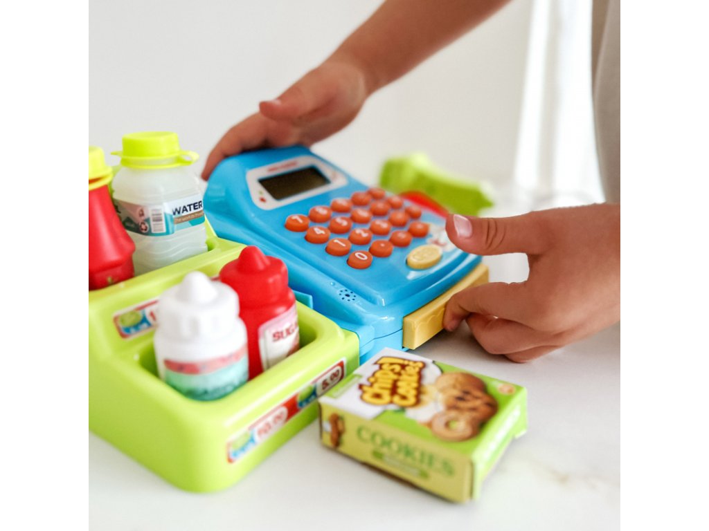 A készlet tartalma: pénztárgép számológéppel és nyitható pénzrekeszel, „süti“ doboz, érmék, hitelkártyák, bankjegyek, polc cikkekkel, szkenner, amely hangokat ad ki.