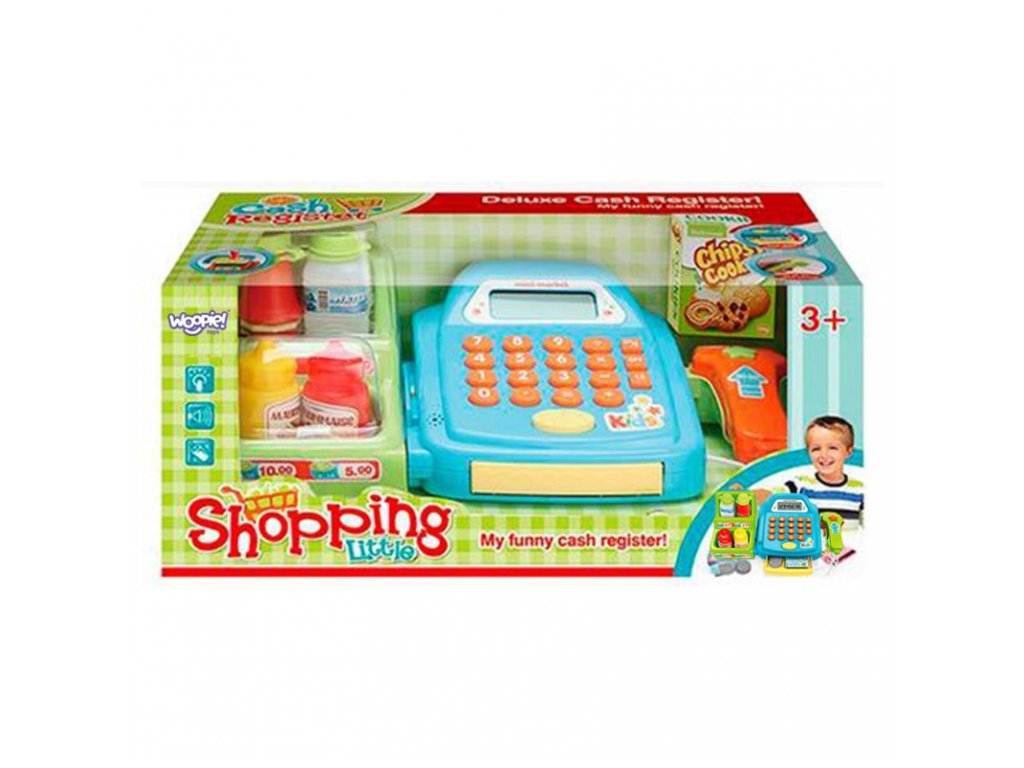 Pokladna s poličkou značky WOOPIE ideális választás a játékhoz. A gyerekek kiválaszthatják a megvásárolni kívánt termékeket, majd behelyezhetik azokat a pénztárgépbe. A sütiket és más termékeket a szkenner segítségével szkennelik be. A vevő ezután készpénzzel vagy hitelkártyával fizethet.