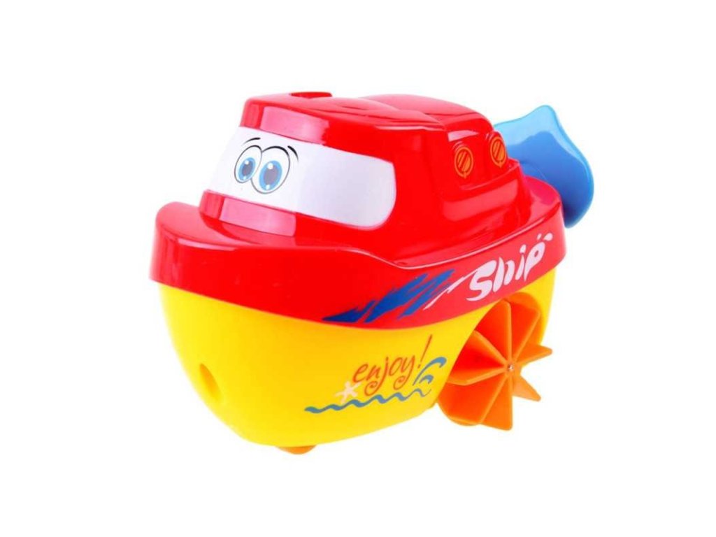 A színes műanyag csónak vidám színeivel és nagy szemeivel vonzza a gyerekek figyelmét.