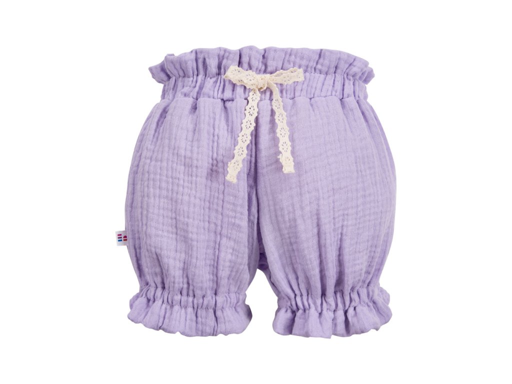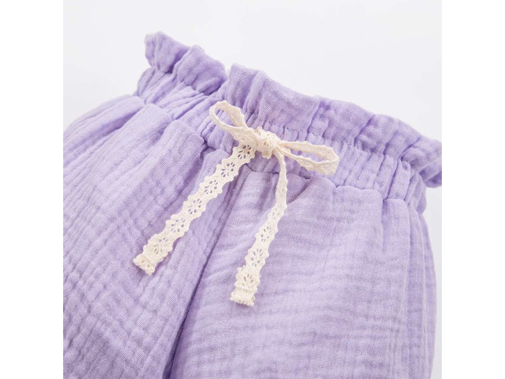 A MEADOW kollekcióból készült gyermek rövidnadrág puha és kellemes tapintású muszlin anyagból. A derékrészbe varrt elasztikus anyag nem nyomja a baba pocakját. Díszítő fodrok a lábakon. A nyújtott szabásnak köszönhetően a rövidnadrág kényelmes és szellős. Ezek a rövidnadrágok a strandon való szórakozás során is nagy sikert aratnak majd.