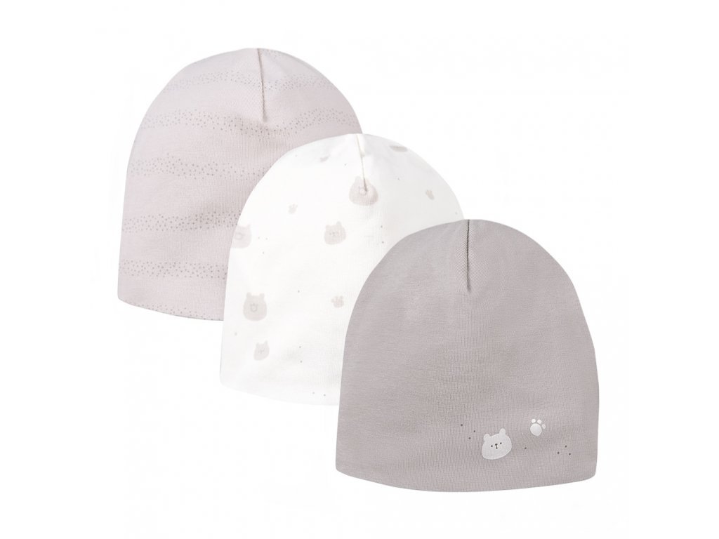 3 darab gyermek sapka puha és kellemes tapintású pamutszövetből készült. Az elasztán hozzáadása biztosítja az ideális illeszkedést a gyermek fejéhez.