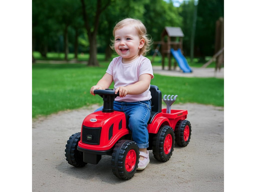 A Baby Mix Benny traktor pótkocsival és szerszámokkal a kis gazdák is megtalálják a számításukat! A Baby Mix Benny traktor pótkocsival és szerszámokkal gyorsan minden gyermek kedvenc játékává válik. A robusztus kerekeknek, a kényelmes ülésnek és a levehető pótkocsinak köszönhetően a gyerekek igazi traktorosokat játszhatnak – otthon és a kertben is.