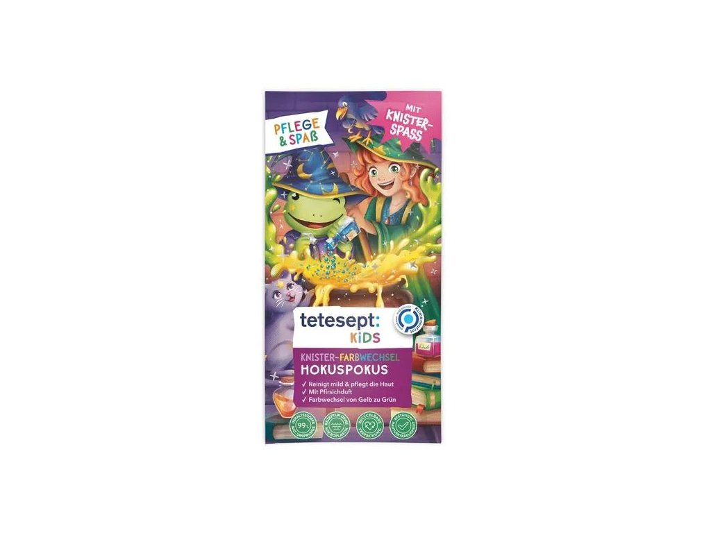 Merülj el egy varázslatos vízi világban Frolumbusszal, a kis békával és Nikával, a boszorkánnyal, akik rendkívüli varázslatot varázsolnak a fürdőkádadba! A "Hókuszpókusz, simsaláda, legyen a víz csokoládé!" varázsformulával felejthetetlen élménnyé varázsolják a gyermekfürdőt. Tetesept Hokuspokus színváltós fürdősó kifejezetten az érzékeny bababőrre lett kifejlesztve. Makadámiaolajat és kakaóvajat tartalmaz, amelyek gyengéden tisztítják a bőrt és biztosítják annak hidratáltságát. Fürdés közben a víz sárgából zölddé változik, és az egész fürdőszobát a barack gyümölcsös illatával illatosítja, emellett perzselő hatást is tapasztalhat. A fürdőhab biztonságos a bőrre, a hajra és a fürdőre. A termék 3 éves kortól használható.