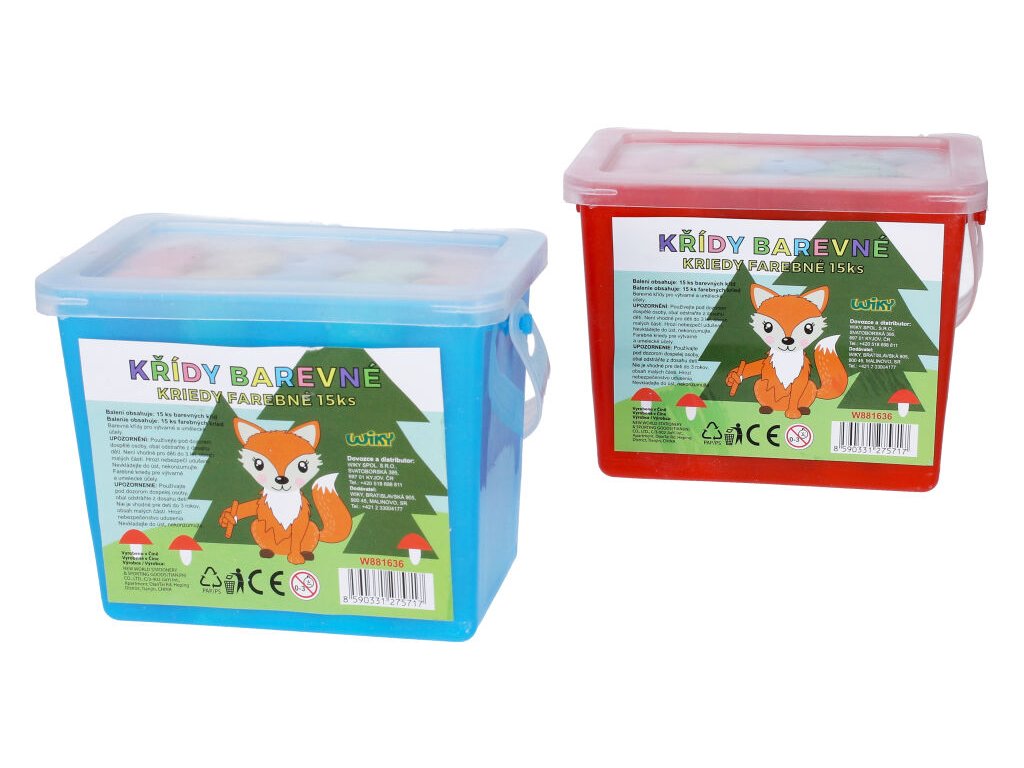 15 darab színes, kerek járdakréta egy erős műanyag dobozban, fedéllel és fogantyúval a könnyű szállításhoz.