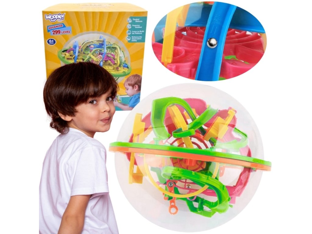 Vidd a következő szintre a játékot a Woopie-val 3D átlátszó golyós labirintussal. Vezesd a fémgolyót hidakon, alagutakon és hullámvasútszerű kanyarokon át! Ez a függőséget okozó, ügyes kirakós játék türelmet, tervezést és pontosságot tanít, míg a színes pályák és a 360°-ban forgatható kialakítás órákon át tartó, gazdagító és kihívást jelentő játékot biztosít a gyermekek számára.