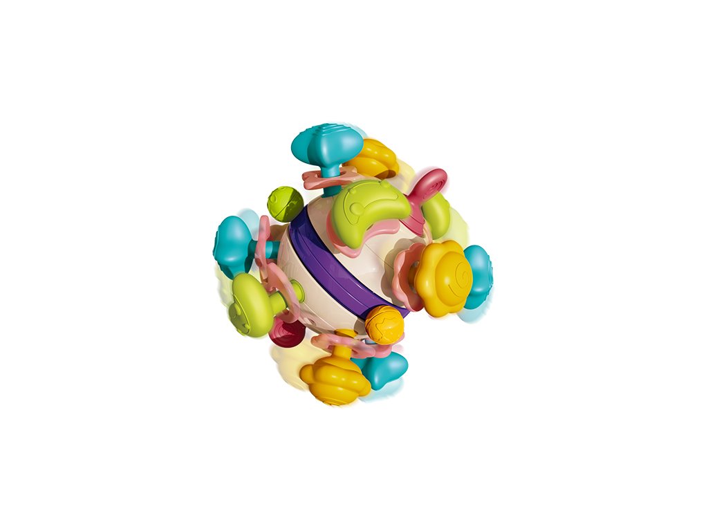 A játékba integrált forgó gyűrű nemcsak mozgásával vonzza a figyelmet, hanem lágy hangokat is ad ki, amelyek serkentik a gyermekek hallásának fejlődését.