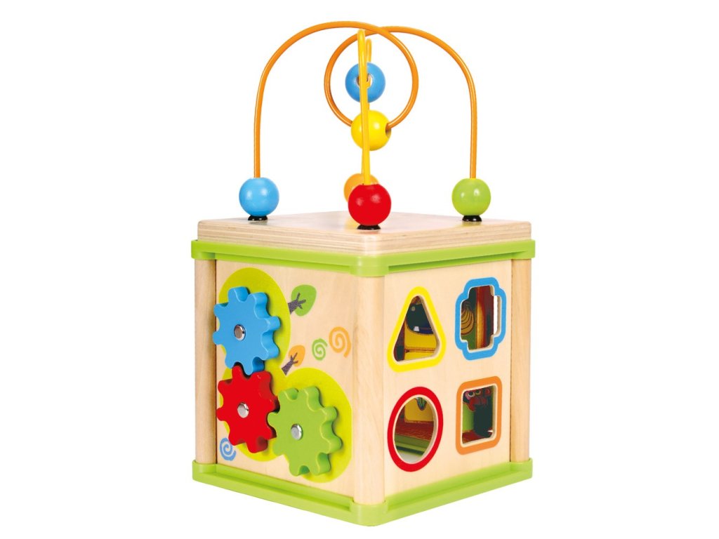 A multifunkciós motoros kocka minőségi játék a kis kezek számára. A különböző tevékenységeknek köszönhetően, amelyeket a gyerekek a kocka minden egyes falán végezhetnek, gyakorolják a finommotorikus készségeket, a logikát és a koncentrációt. Anyag: fa és műanyag
