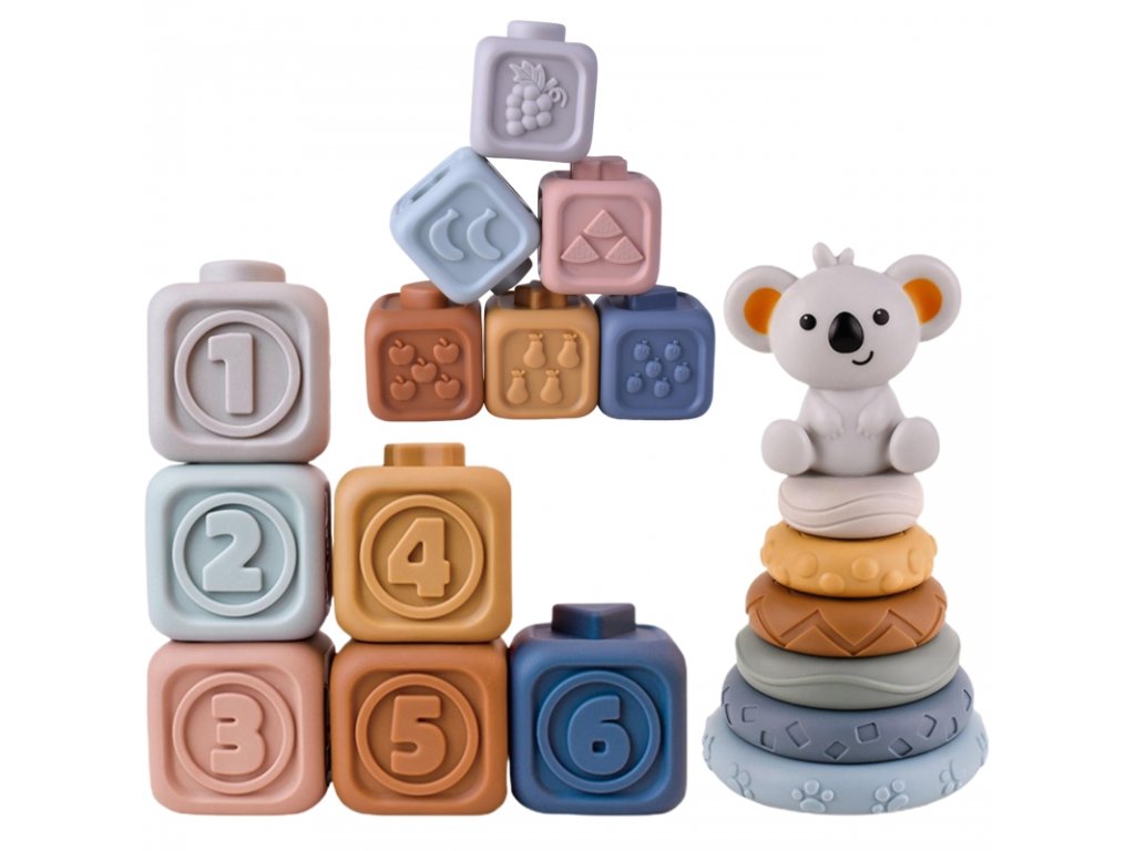 Bájos oktatási készlet Márkák WOOPIE tökéletes választás biztonságos és fejlesztő ajándék minden kisgyermeknek. A játék rugalmas, nem mérgező anyagból készült, és foghúzóként is használható a fogzás enyhítésére. A készlet piramisból és blokkból áll . 18} , amelyek széles oktatási és érzékszervi lehetőségeket kínálnak. Hat különböző méretű körből álló piramis, amelyek egy aranyos koala karakterrel végződnek, és hat domború számokat tartalmazó kockából áll. sokoldalú játék, amely több szinten serkenti a gyermek fejlődését.