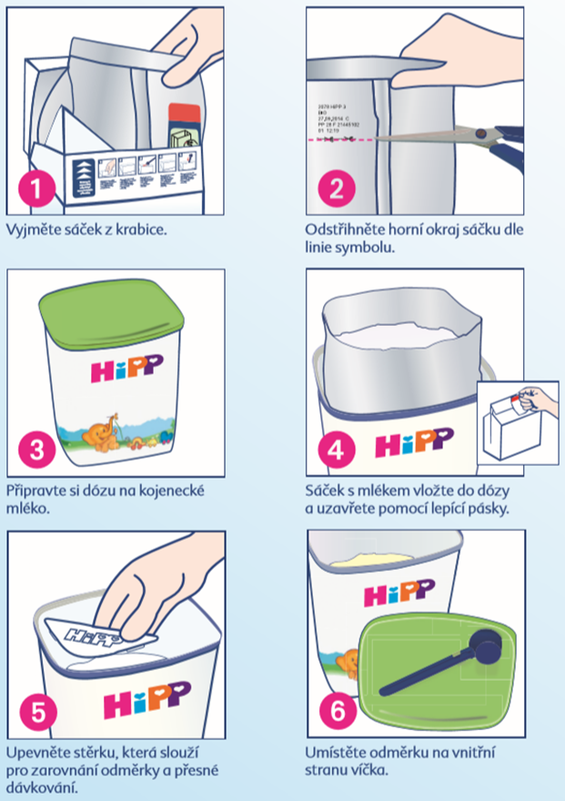 Praktikus műanyag doboz szárított csecsemőtápszerhez, vidám HiPP elefántos gyermekmotívummal. A doboz védi a tejet a levegőtől és a nedvességtől. A doboz része egy spatula, amely a mérőkanál kiegyenlítésére és a pontos adagolásra szolgál. A fedél belső oldalán hornyok találhatók a mérőkanál egyszerű és kényelmes bepattintásához. Az első használat előtt mossa ki a tejtartót (ne tegye mosogatógépbe).
