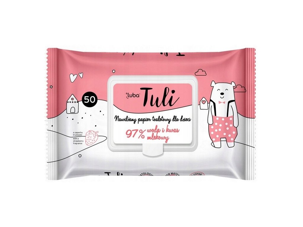A "Luba Tuli" nedvesített WC-papír gyerekeknek tökéletes módja annak, hogy minden WC-használat után tiszta és friss maradjon. Az ápoló tulajdonságairól ismert összetevőkkel, mint például a pantelone, allantoin, tejsav és áfonyakivonat, kiegészített egyedülálló formula a gyengéd tisztítás és ápolás érzését nyújtja. A rendkívül kellemes, édes eper illatú papír tökéletes megoldás a gyermekek számára, hogy megtanulják önállóan használni a WC-t. Alkalmas a WC-n való lehúzásra. Fiziológiás pH-jú, bőrgyógyászatilag tesztelt termék. A papír anyaga 100%-ban természetes, biológiailag lebomló és komposztálható. Az anyák és gyermekeik igényei alapján, szeretettel készült.
