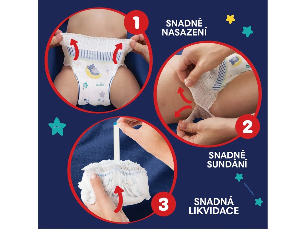 A Pampers Night Pants pelenka puha és rugalmas, így mindig alkalmazkodik a babához. Kényelmes felvenni, és az oldalukon elszakíthatóak a könnyű váltás érdekében.