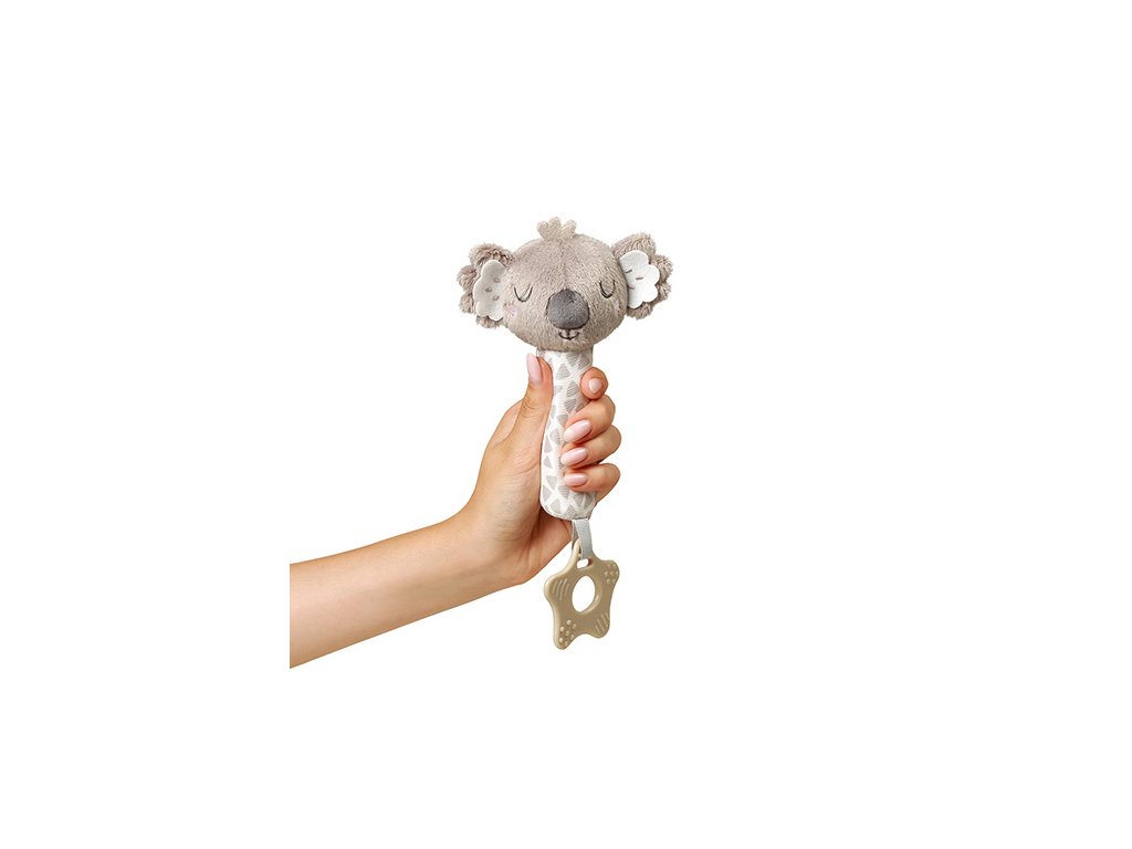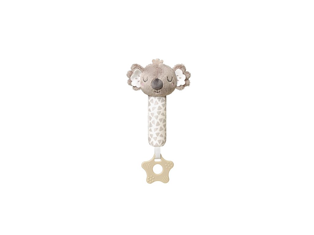 Ismerd meg a puha és ölelgetős, nyikorgó plüss Koala Cocót. Ideális ölelésre és megnyugtatásra. Csak óvatosan nyomja meg a játékot, hogy hallja a boldog nyikorgást. Puha fülek támasztják a fogást. A geometriai minták pedig vonzzák a gyermek figyelmét. A Koala egy fogpiszkálóval is rendelkezik, hogy segítsen a babának a fogzásnál.